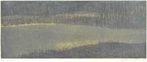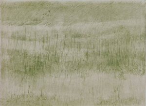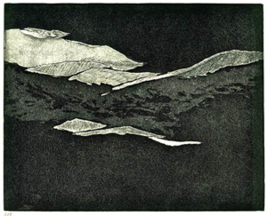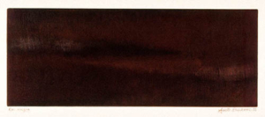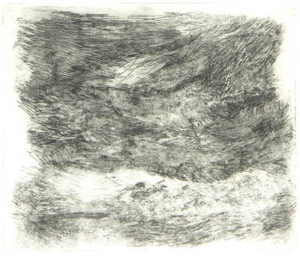 Il s’agit ici d’expérimenter la gravure non pas dans le sens de « reproduire » une image mais dans le sens de « peindre » avec l’encre et le papier. Dans les années 1990, entourée des montagnes de mon pays d’adoption, j’ai imaginé la succession des paysages vallonnés se superposant avec celles, fanstasmées, de mon pays de naissance, si plat, si brumeux, la Belgique. Les encres s’épaississaient dans l’accumulation des passages sous la presse, les lumières ourdissaient, lointaines. J’obtenais des transparences colorées uniques et sourdes. Bleus chargés, rouges brunis ou jaunes verdâtres. Des indéfinitions colorées où la forme se perdait. En écho, des pointes sèches juste frottées d’encre noire laissaient respirer des accents de paysage où le support papier se ranimait. Reste ces centaines de papiers gravés dans les caves de la Cité des Arts à Paris ou sur les hauteurs, dans le château de Salzbourg, marqués par l’odeur de l’expérience, les résistances des papiers mouillés.