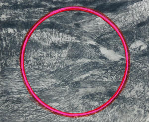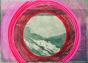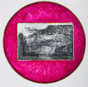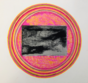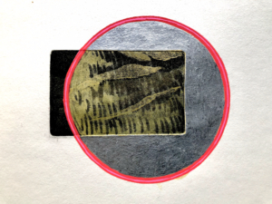 Une partie des gravures est réinvestie avec les cercles colorés (tracés aux feutres, aux crayons de couleurs vives) ou découpés. Le papier gravé, parfois multiples, devient le support où s’inscrivent les changements de perceptions et de regards dans la durée ; actualisés. Une boucle ininterrompue de la vision lointaine à celle zoomée sur le paysage. L’horizon ici ne s’aperçoit pas au travers de lignes verticales mais est cerclé, encerclé, paradoxalement libéré.