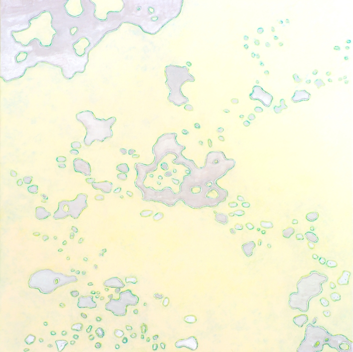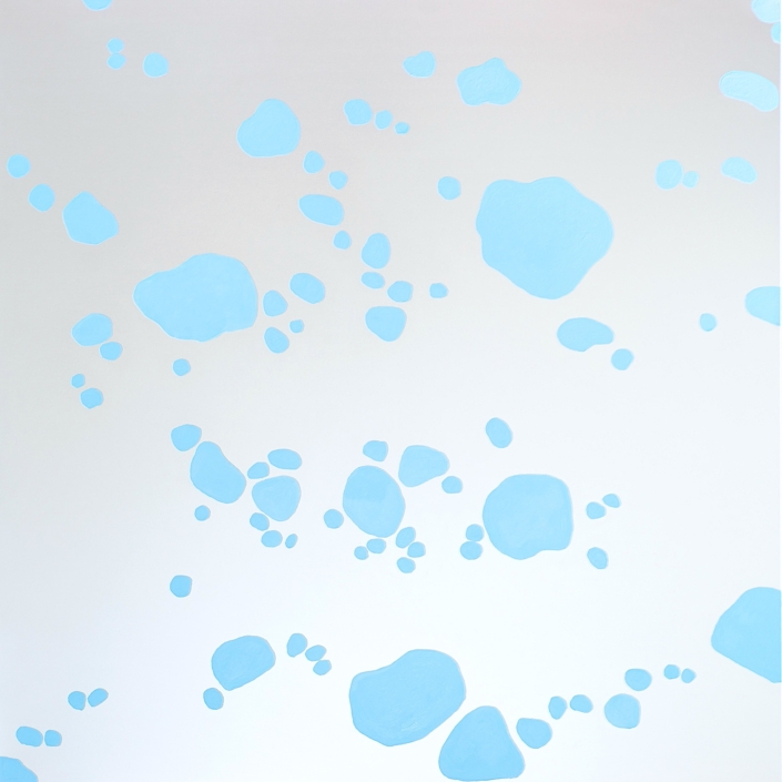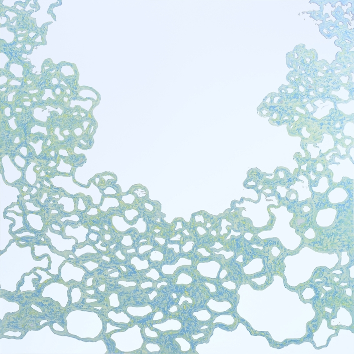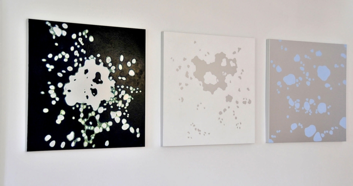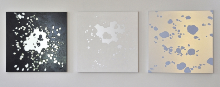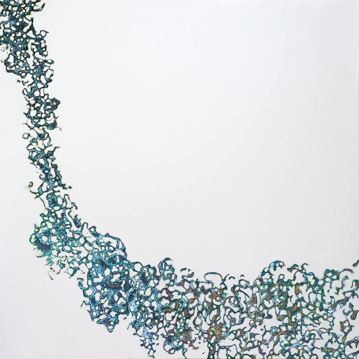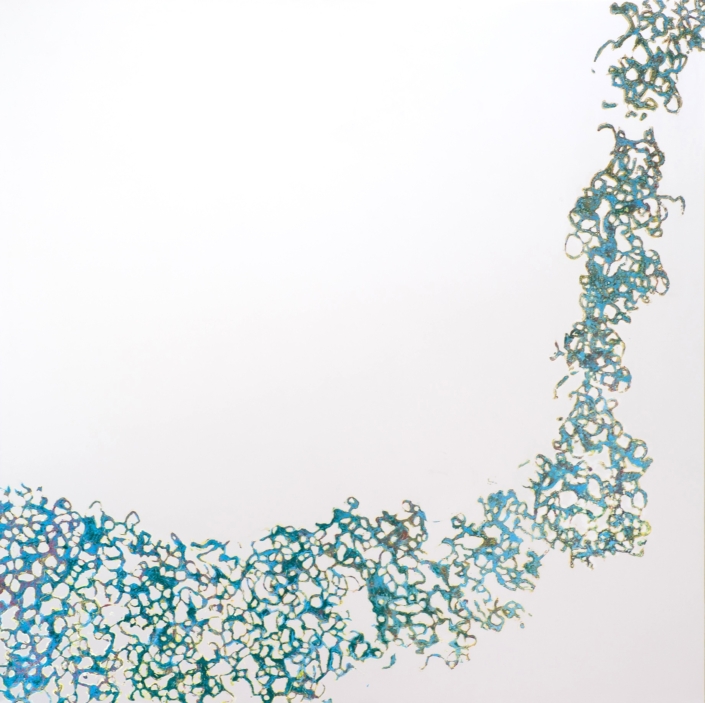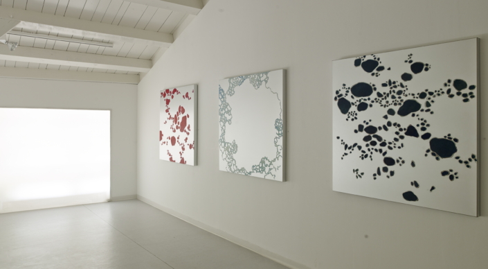 Elle peint des arabesques colorées, mais ce ne sont qu’ombres et lumières, jeux de formes immobiles, tellement immobiles qu’elles suggèrent l’infini du cosmos dans une fixité atemporelle. Partant de la découpe des frondaisons sur le ciel, elle construit l’immensité. L’appel du vide est au centre des compositions dont l’apparente sérénité est le fruit d’une sensibilité exacerbée, que l’acte de peindre parvient à transcender à travers la recherche de l’équilibre formel. Les travaux les plus récents s’émancipent de ce va et vient des effacements et des recouvrements. Ils affirment d’une façon limpide le rapport entre le peint et le non peint ; les aplats délicats réduisent la distinction entre les matières et intensifient le sentiment d’espace. Certains disques métalliques sont même totalement dénués de couleur pour ne laisser apparaître que des éclats de lumière d’une éblouissante simplicité.
