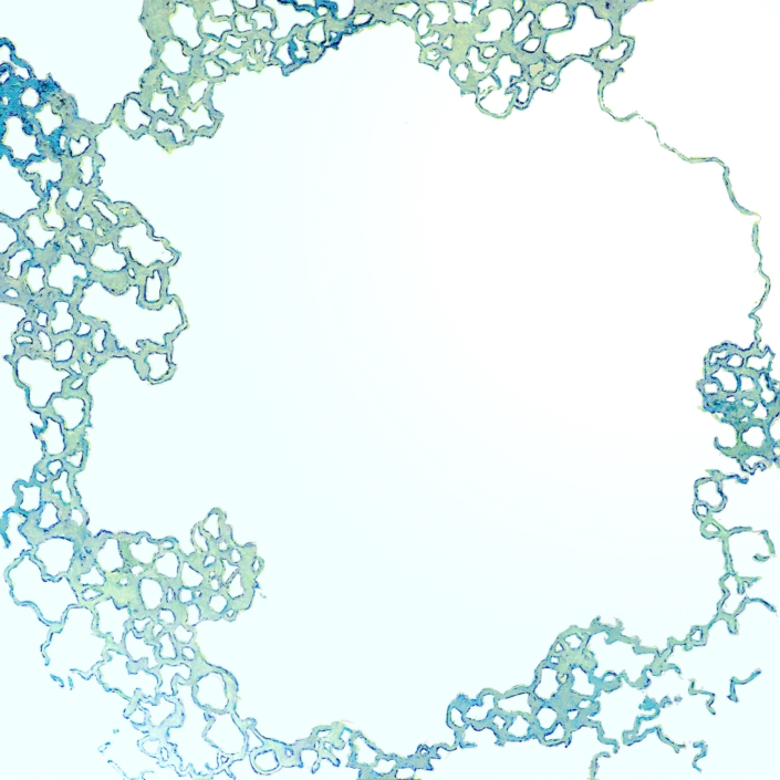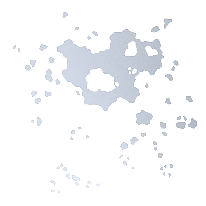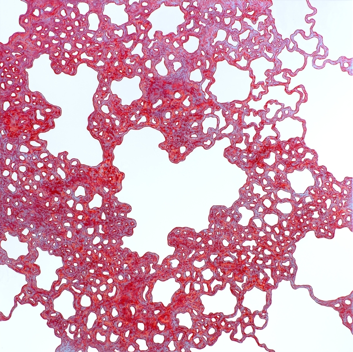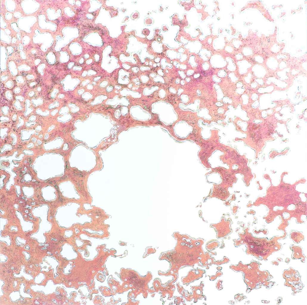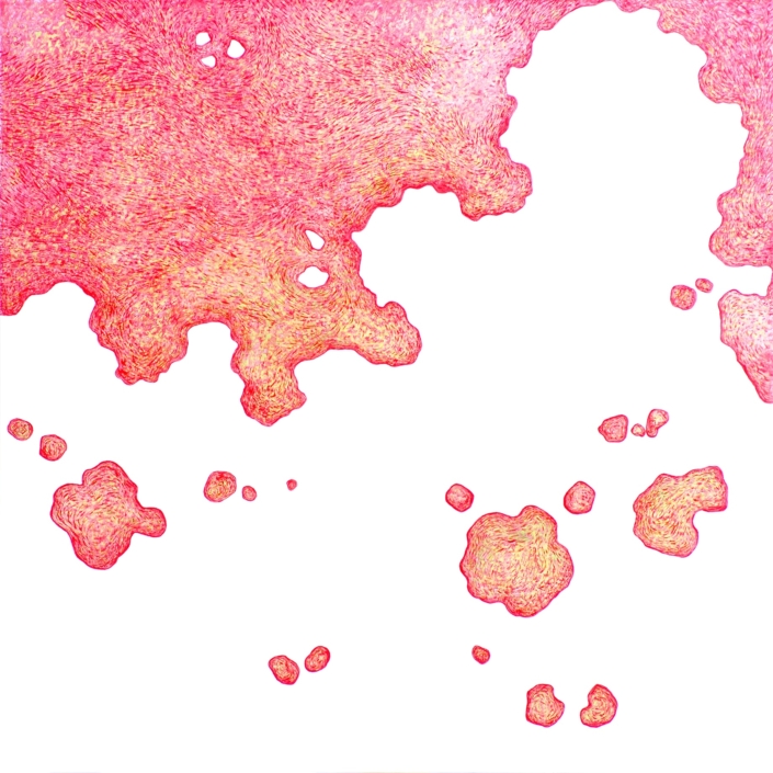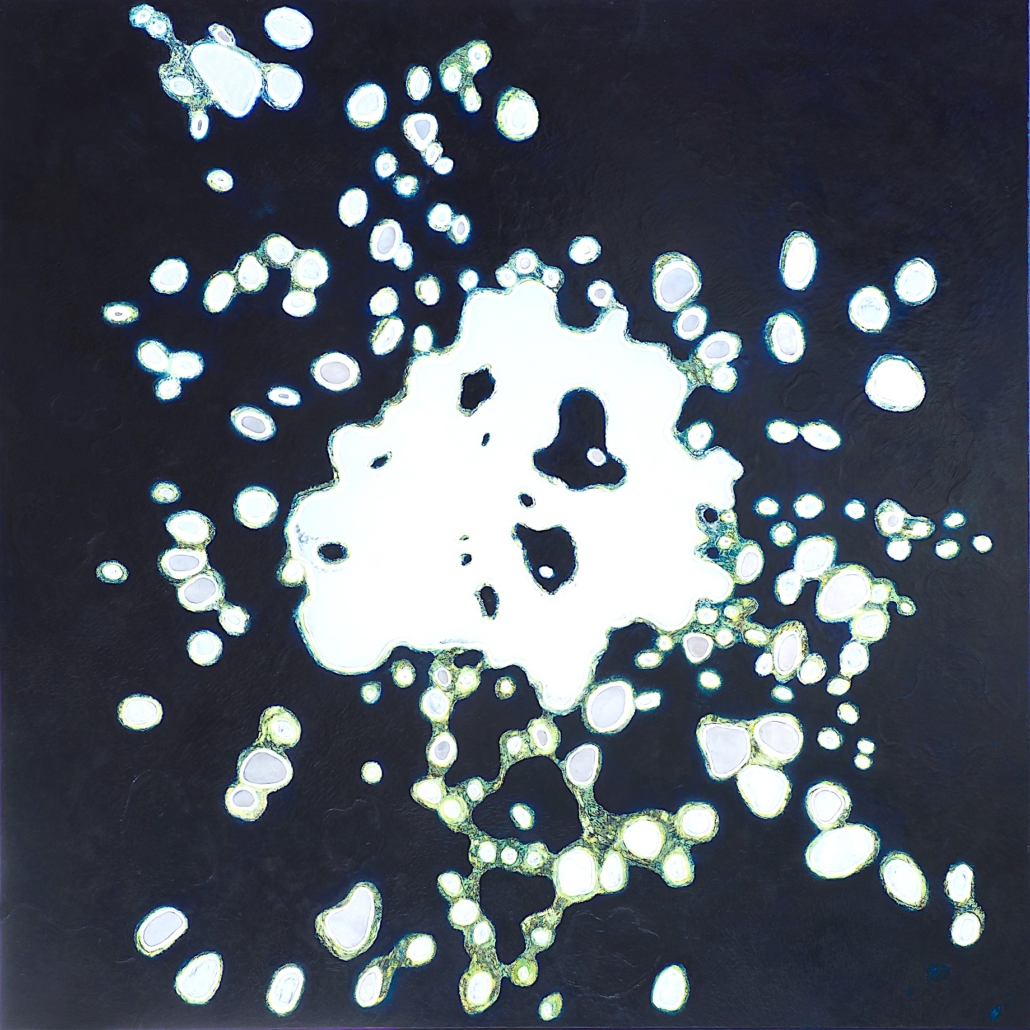 Elle peint des arabesques colorées, mais ce ne sont qu’ombres et lumières, jeux de formes immobiles, tellement immobiles qu’elles suggèrent l’infini du cosmos dans une fixité atemporelle. Partant de la découpe des frondaisons sur le ciel, elle construit l’immensité. L’appel du vide est au centre des compositions dont l’apparente sérénité est le fruit d’une sensibilité exacerbée, que l’acte de peindre parvient à transcender à travers la recherche de l’équilibre formel. Les travaux les plus récents s’émancipent de ce va et vient des effacements et des recouvrements. Ils affirment d’une façon limpide le rapport entre le peint et le non peint ; les aplats délicats réduisent la distinction entre les matières et intensifient le sentiment d’espace. Certains disques métalliques sont même totalement dénués de couleur pour ne laisser apparaître que des éclats de lumière d’une éblouissante simplicité.
