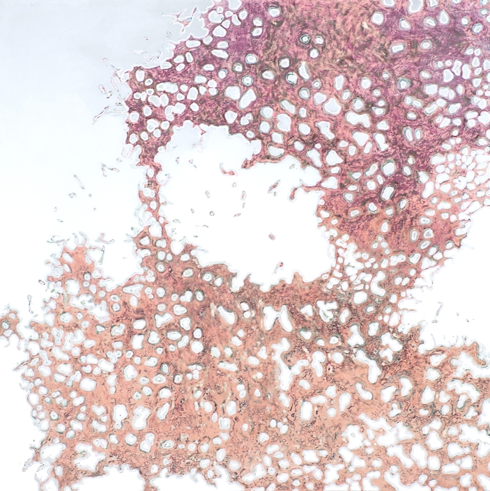 C’est dans un véritable corps à corps avec la surface fine et résistante que l’artiste réalise des pièces qu’elle reprend sans cesse, parfois durant des années.