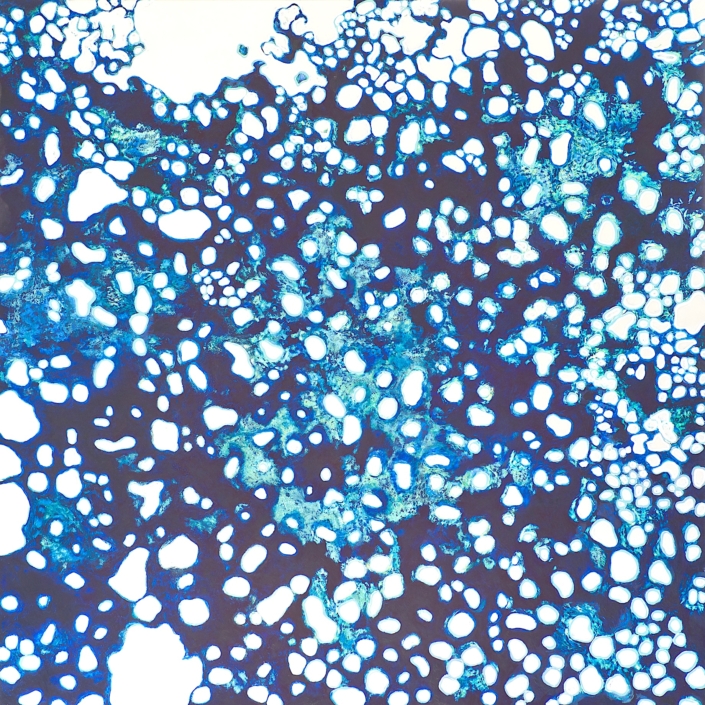 Elle a beaucoup pratiqué la gravure, ce qui explique, peut-être, le lien si particulier qu’elle entretient avec le métal, son support actuel. Son travail est bâti sur les notions de temps et d’espace. Il se développe dans la durée, par touches successives, pour articuler les tensions entre matité et brillance, huile et surface métallique, plein et vide. Le résultat est si lisse qu’on ne peut imaginer le nombre de couches superposées, ni celui des ponçages effectués pour apporter une nuance, retrouver une couleur ou libérer une parcelle d’aluminium.